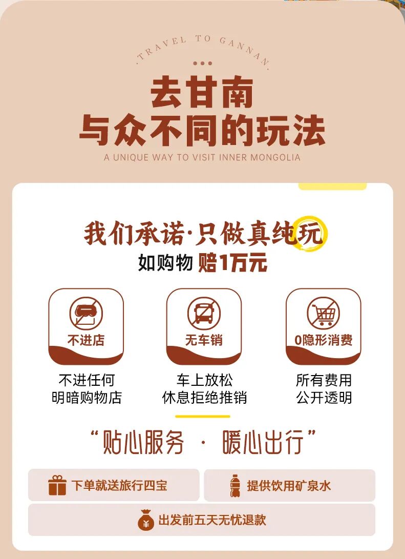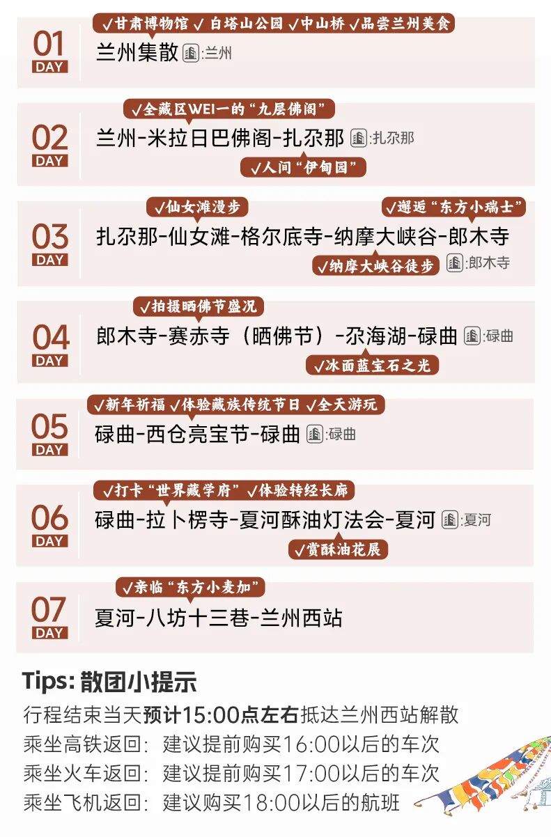 2、行程结束当天15:00左右抵达兰州西站,大家可以依据自己的时间,自行选择继续游玩或是启程回家。火车建议购买17:00以后的车次,高铁建议购买16:00以后的车次,飞机建议购买18:00以后的航班。兰州火车站距离兰州中川机场约68公里,车程约1.5小时。兰州站距离机场大巴客运中心站徒步300米,到达机场71公里,用时1小时25分钟左右,大家根据自己的航班车次选择返程票。