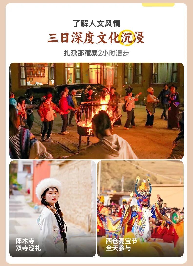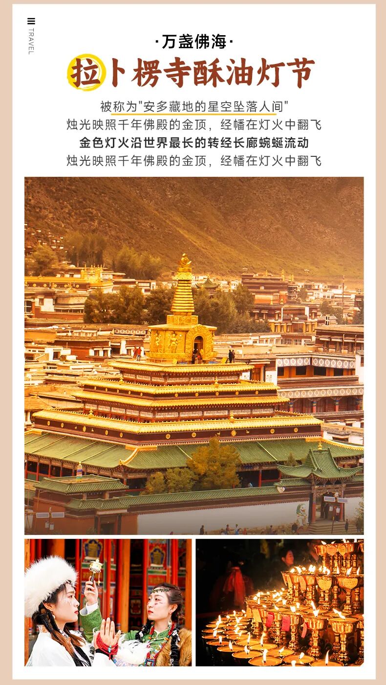 游玩结束后前往夏河酒店办理入住,傍晚步行前往拉卜楞寺参加【酥油灯法会】,傍晚的法会渐入佳境,大经堂周围陈列着僧人用冰手制作的酥油花,佛像、花卉造型栩栩如生,在冷空气中更显精致。天色渐暗时,万盏酥油灯依次点亮,暖黄的灯光映着雪夜,信徒们手捧哈达排队朝拜,诵经声混着远处的法号声,桑烟在灯光中袅袅升起。偶尔有雪花飘落,与灯光交织成梦幻画面。 活动结束后步行返回【夏河】入住,好好休息迎接后续行程。