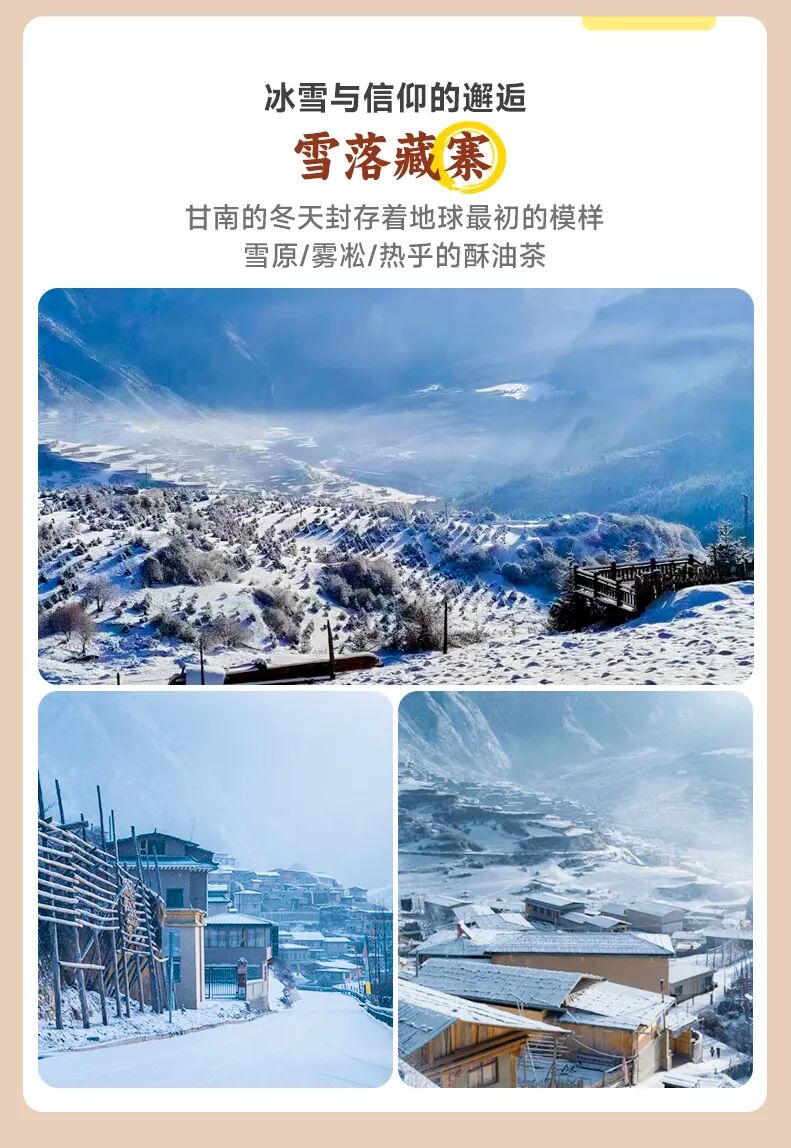 游玩结束后前往【扎尕那】(行程约:168KM,车程约4.5小时)冬季的扎尕那化身为冰雪秘境,迭山雪峰清晰可见,山体呈灰白色。藏式石屋分布在山间,屋顶覆盖着厚雪,积雪覆盖的藏寨木屋升起袅袅炊烟,冻住的梯田凝成天然镜面,倒映着嶙峋的石峰。夜晚入住景区藏式民宿,推窗可见星河笼罩雪山的旷野奇观。