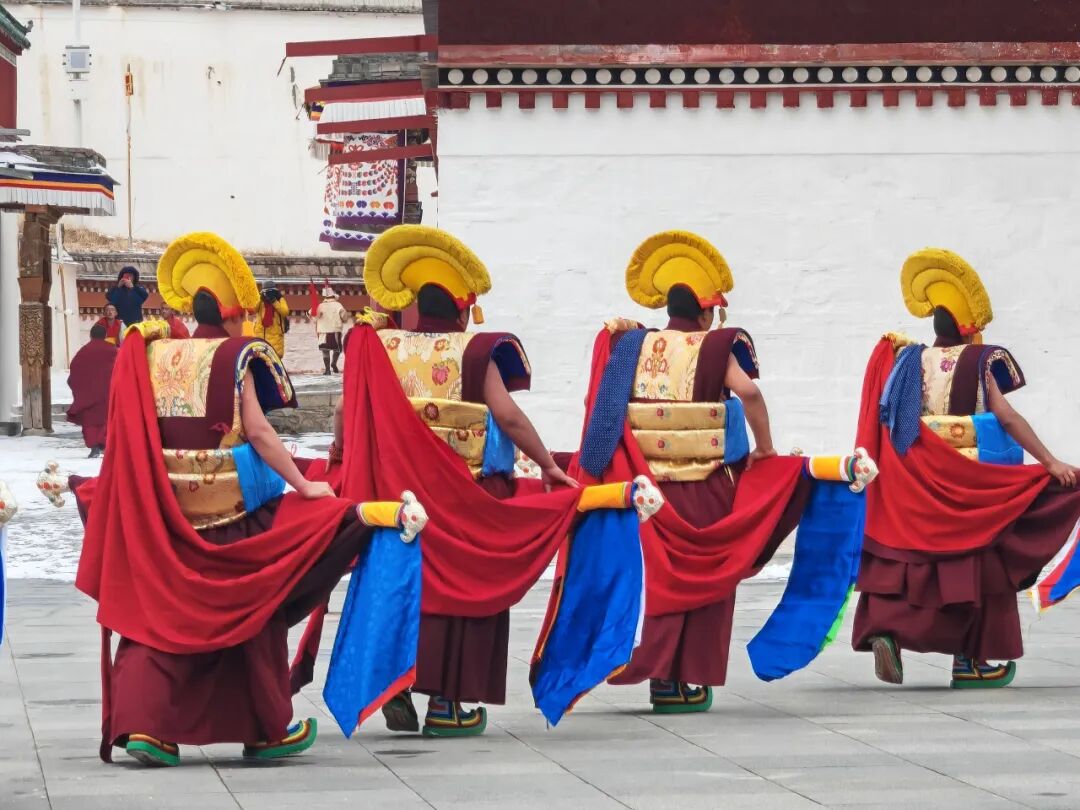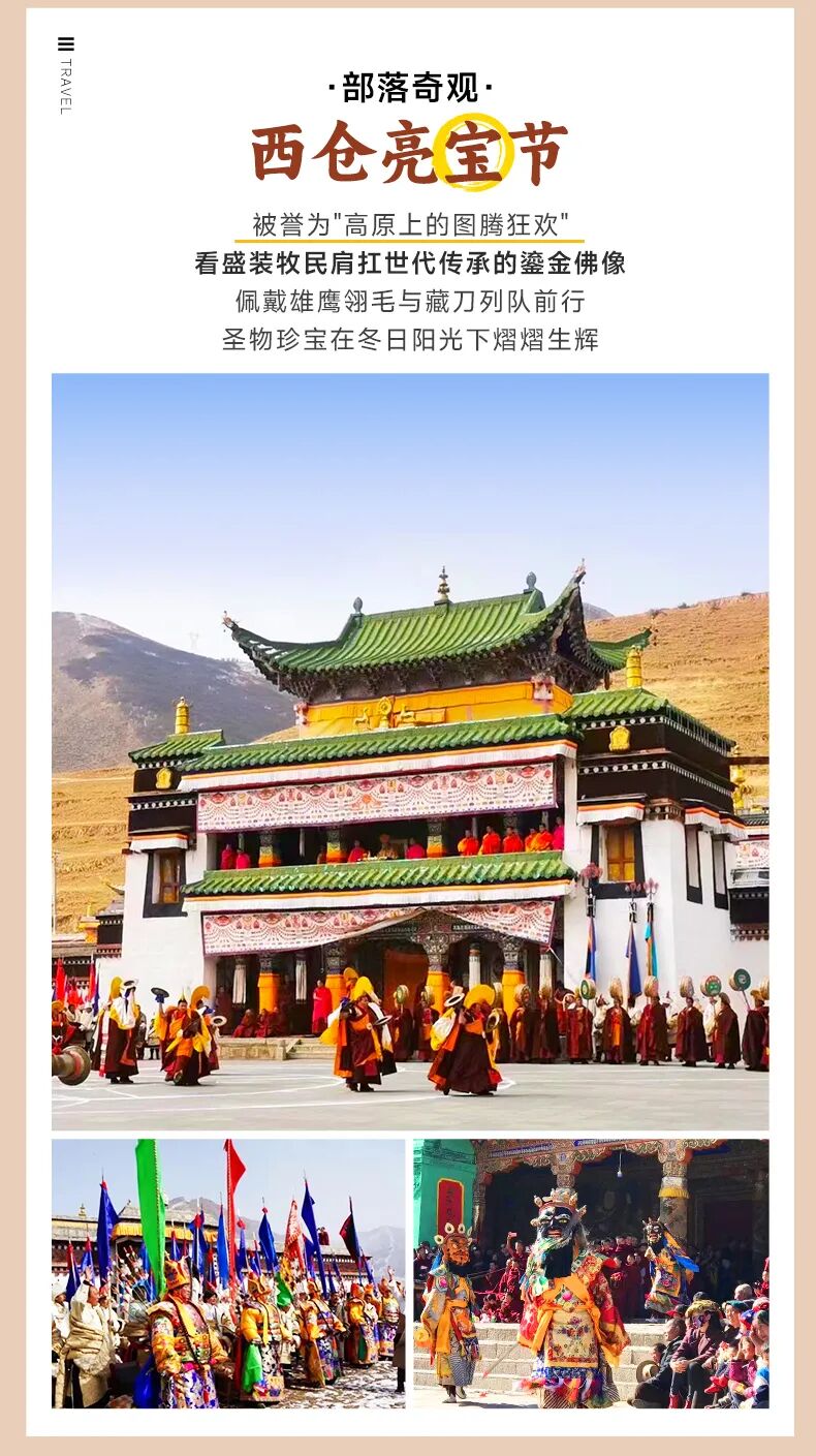 早餐后,我们从酒店集合出发,乘车前往【西仓寺(亮宝节)】冬日的西仓寺被厚雪覆盖,寺庙金顶在晨光中闪着微光。各部落的藏族同胞身着绣金藏袍,头戴珊瑚玛瑙头饰,举着经幡列队而行,宝物在白雪映衬下格外夺目。喇嘛们吹响长号,桑烟混着雪粒升腾,金刚法舞的面具在寒风中晃动,舞步踏碎积雪发出咯吱声,整个场面庄重又热闹。