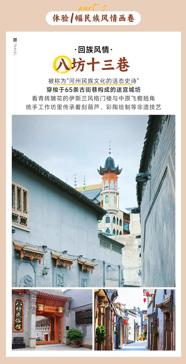早餐后,我们从酒店集合出发,乘车前往【八坊十三巷】(行程约:103KM,车程约1.5小时,游玩约2小时)。冬季的八坊十三巷裹着薄雪,青砖灰瓦上积着雪粒,红灯笼挂在巷口屋檐下,衬得古巷格外喜庆。踩着巷里防滑的石板路逛游,老字号店铺敞开着门,甜醅子、灰豆子的热气从门缝里飘出来,砖雕照壁上的花纹沾了雪,更显精致。偶尔能看见居民提着菜篮踏雪回家,巷子里满是暖融融的生活气。