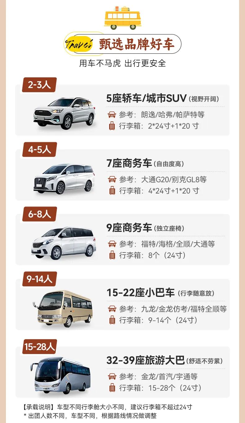 28人品质团:8人及以下司机兼向导;8人以上(不含8人)安排1名领队