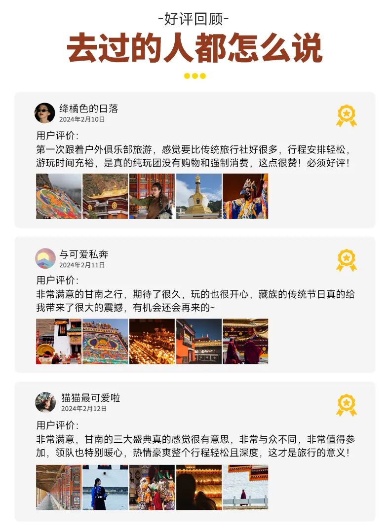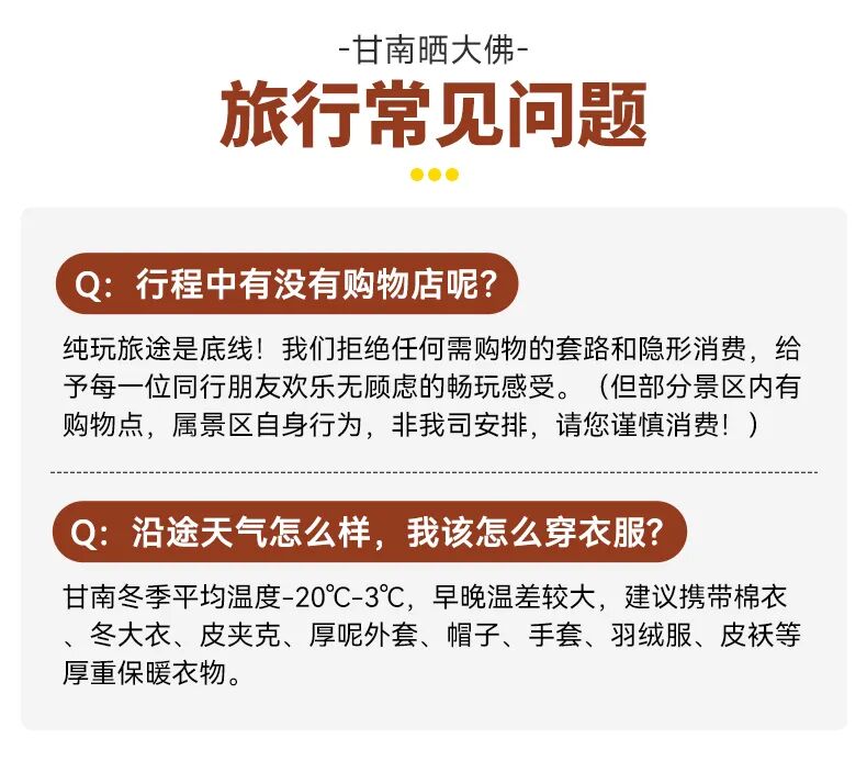 2、我们会在出发前三天以短信的方式通知您集合酒店及领队联系方式,领队会在出发前一天下午18:00前联系您,请您保持电话畅通。到达酒店前台报【甘南晒大佛+姓名】凭有效证件办理入住手续(酒店一般入住时间为14:00之后,如您到达较早,可将行李寄存在前台,自行在市区逛逛)