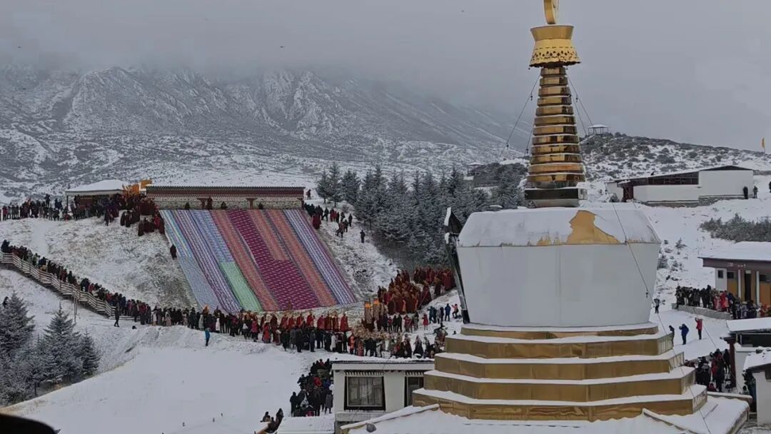 早餐后,我们从酒店集合出发,步行前往【赛赤寺(晒佛节)】(行程约:1KM,步行约 15 分钟,游玩约 3 小时)。冬季晒佛节格外热闹,寺外雪地早挤满裹厚藏袍的信徒,喇嘛们抬着巨大的红布佛像沿坡而上,佛像在白雪映衬下格外醒目。寒风里,经幡猎猎作响,信徒们手转经筒、煨桑祈福,桑烟混着雪粒飘向天空,佛像展开后,众人俯身叩拜,场面庄重又温暖。