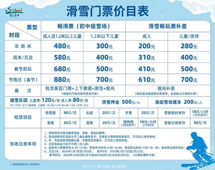 *雪板、雪鞋、雪杖租赁费用皆包含在滑雪票中