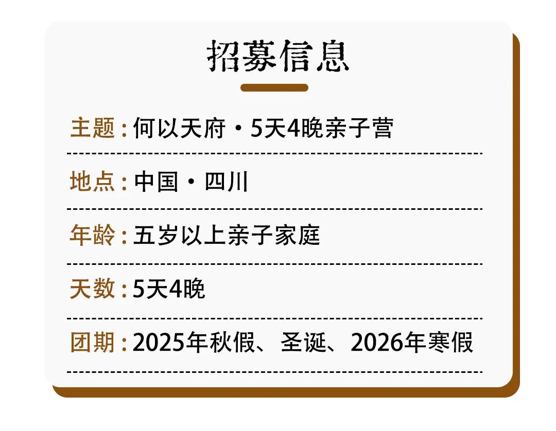整趟旅程是—场沉浸式文化考古,孩子们将像考古学家—样,每日挖掘—个文化基因片段,完成从 “碎片”到“图谱”的整合,构建对成都立体而完整的理解,获得可迁移的思维方式和文化洞察力
