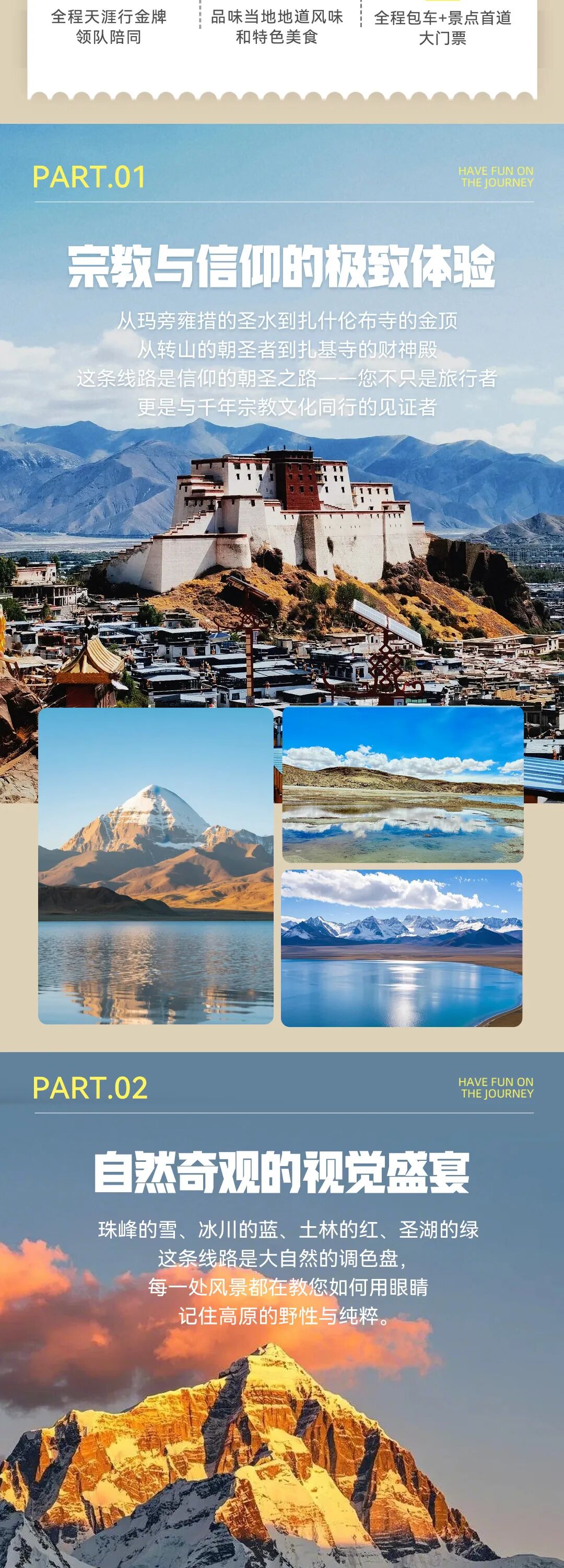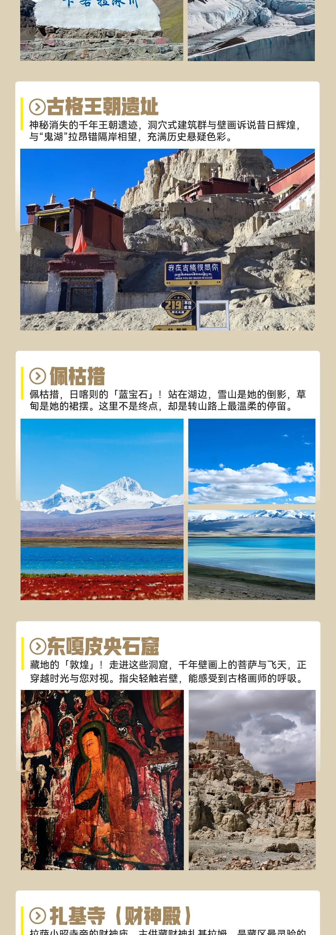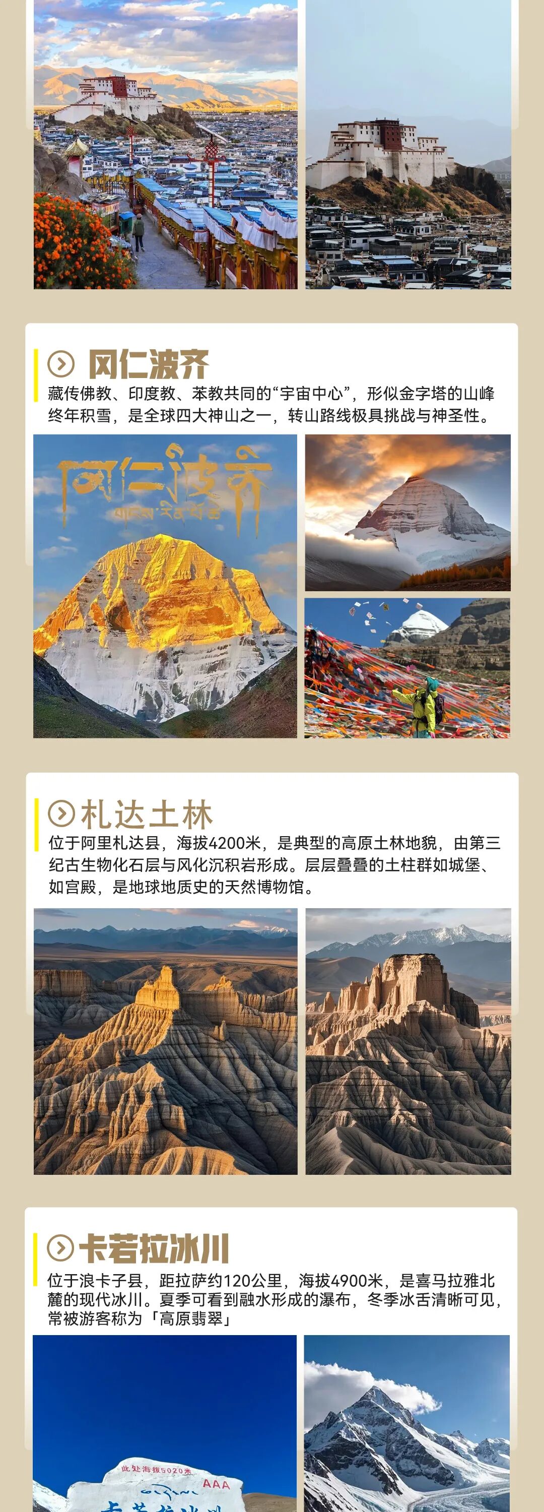 3、行程所含景点首道大门票(珠峰大本营门票160元+观光车120元、冈仁波齐门票150元或古格王朝门票65元+观光车30元、卡若拉冰川门票50元)