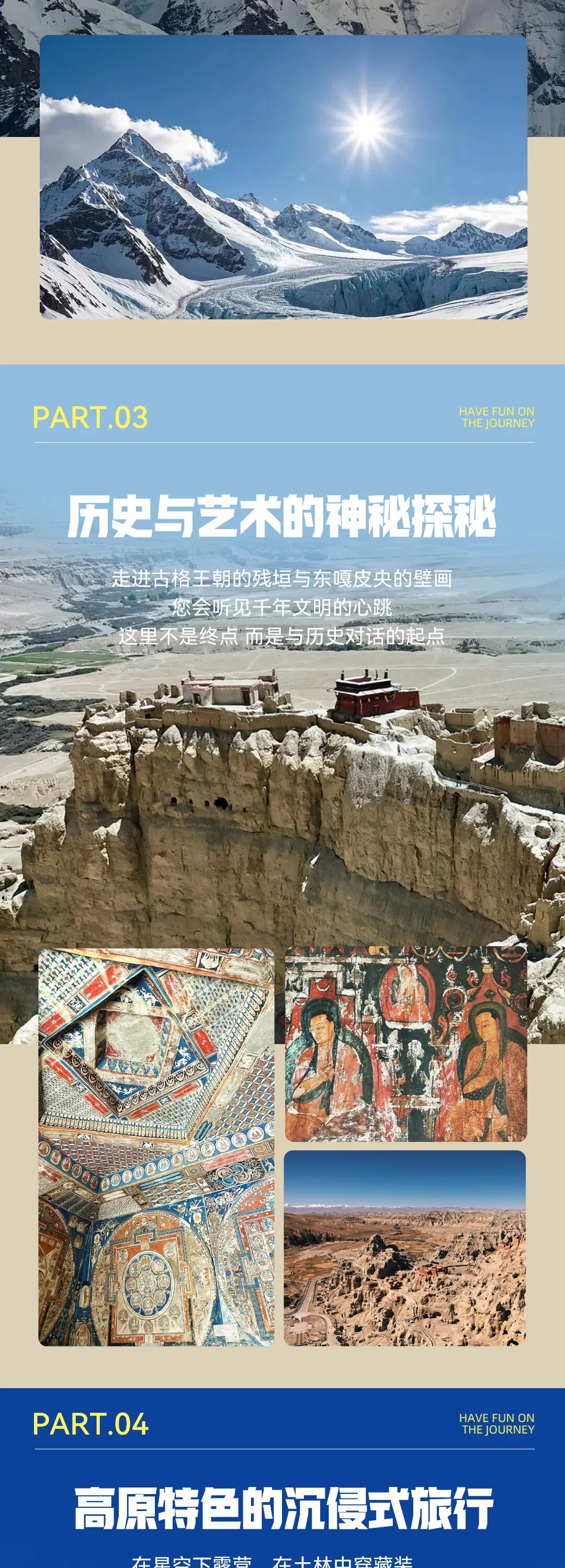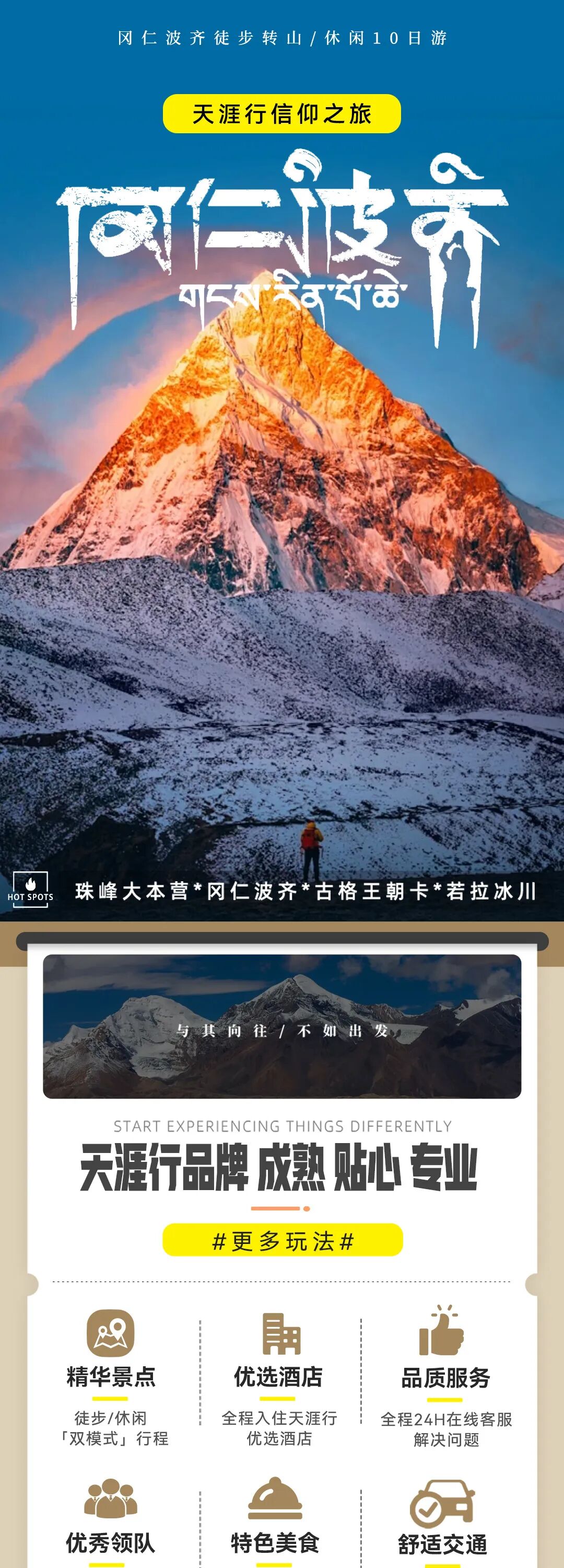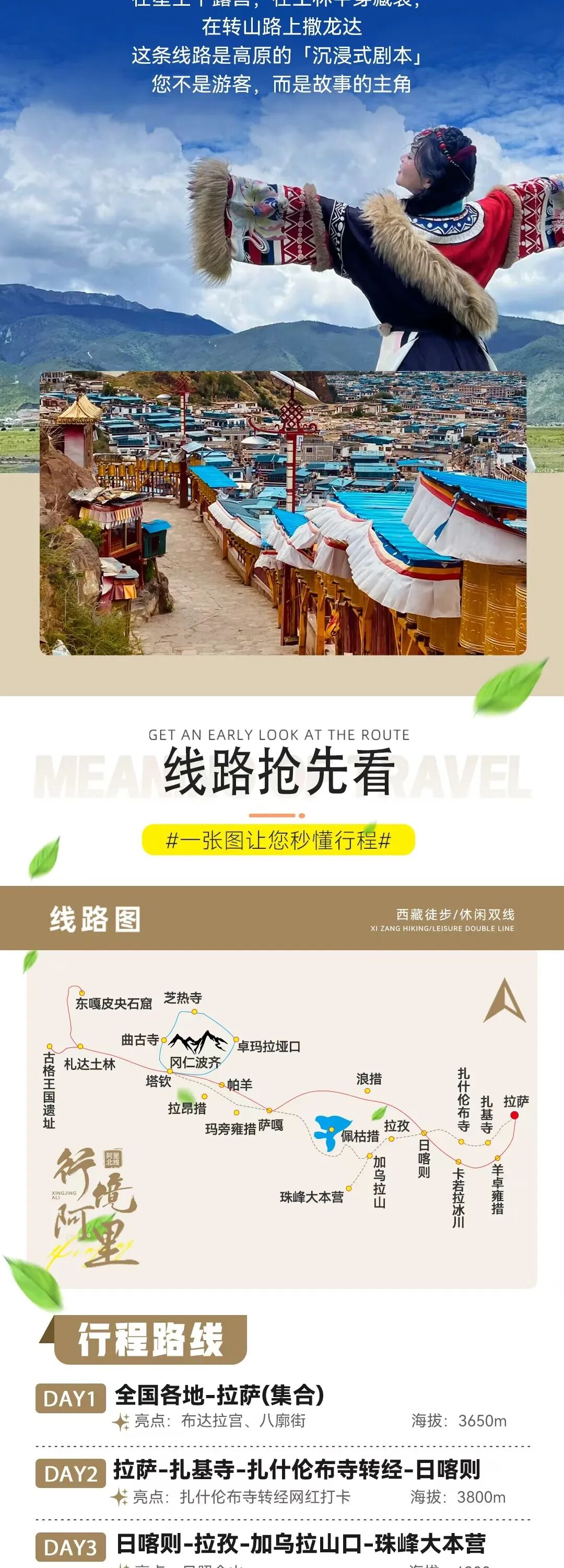 3、行程所含景点首道大门票(珠峰大本营门票160元+观光车120元、冈仁波齐门票150元或古格王朝门票65元+观光车30元、卡若拉冰川门票50元)