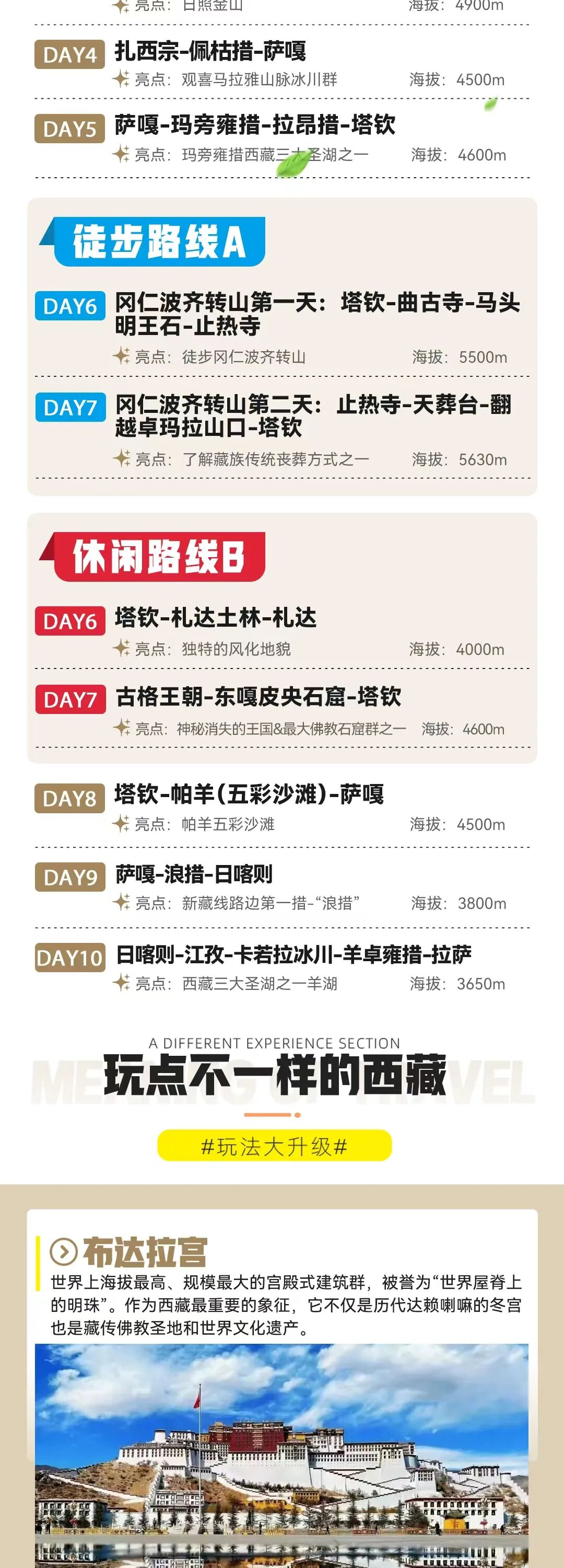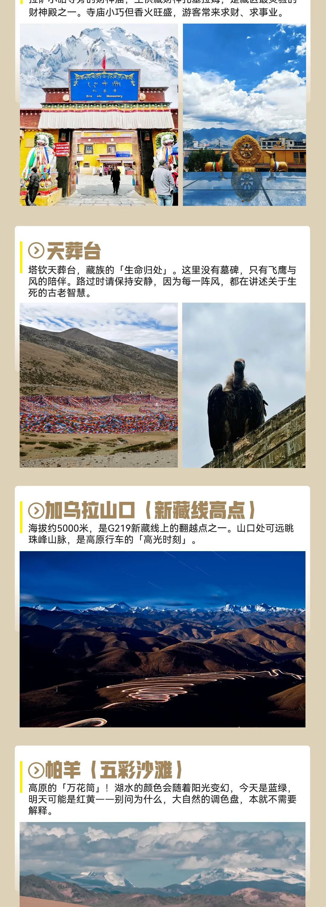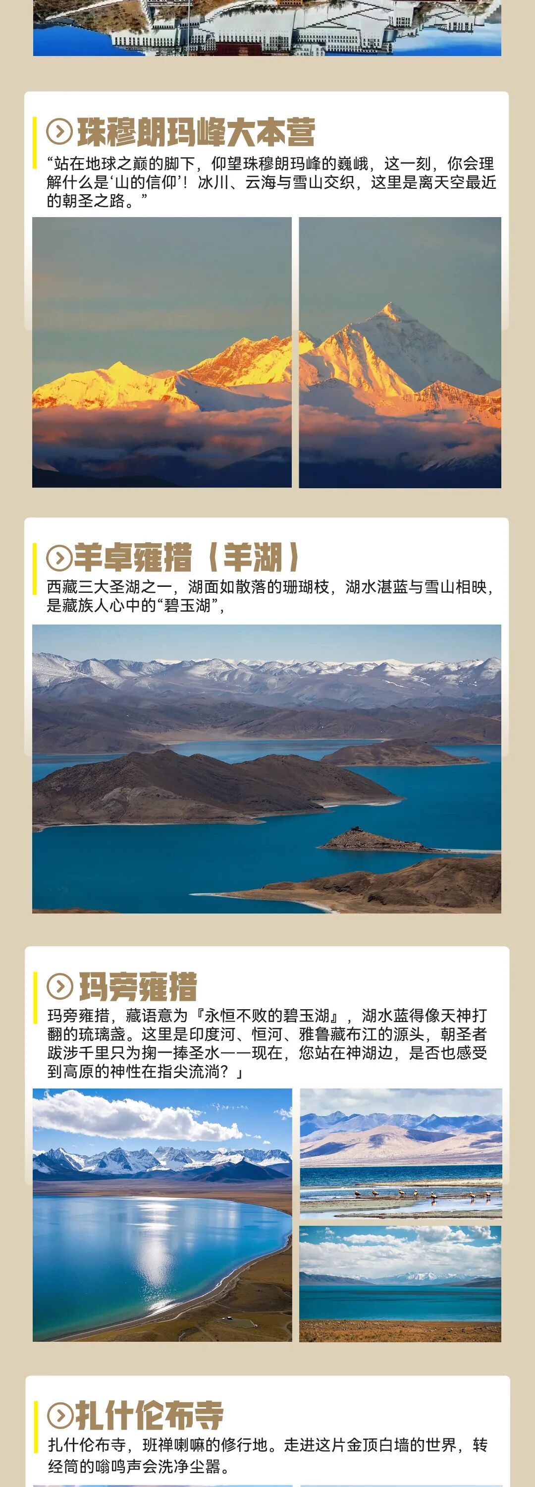 3、行程中所列景区门票外的其他景区费用,不含扎什伦布寺门票、不含羊卓雍措门票、不含拉萨市区自由活动期间门票如布达拉宫、大昭寺门票,不含景区内二次消费(如电瓶车、骑马、冈仁波齐转山背夫等等)