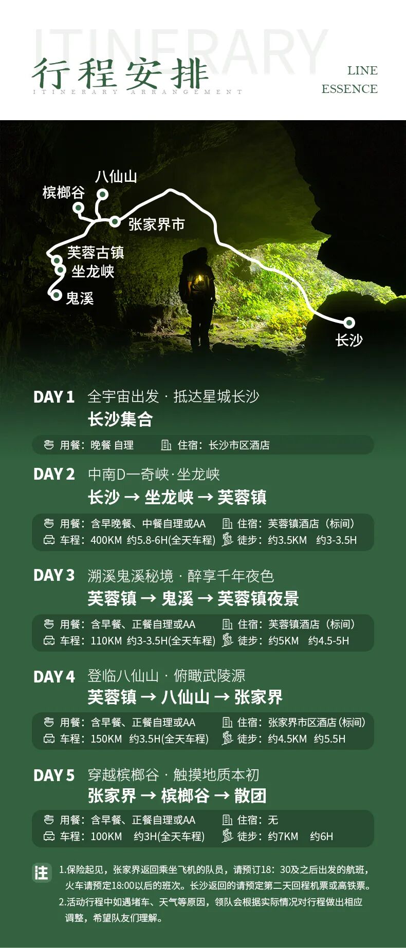早餐后乘车前往户外圣地——槟榔谷。徒步“天使之城”:沿幽深曲折的暗河河道摸索前行,经历“柳暗花明”的豁然开朗。穿越秘境“夹儿沟”,穿行于一线天般的峡谷,感受峰回路转的景致。徒步结束后,返回张家界西站散团(预计17:00前到达张家界西)。需返回长沙的贵宾,可继续乘坐大巴日返程)。
