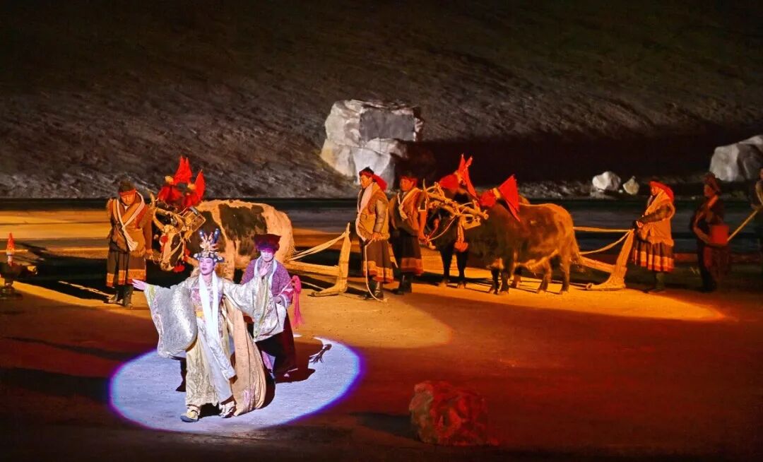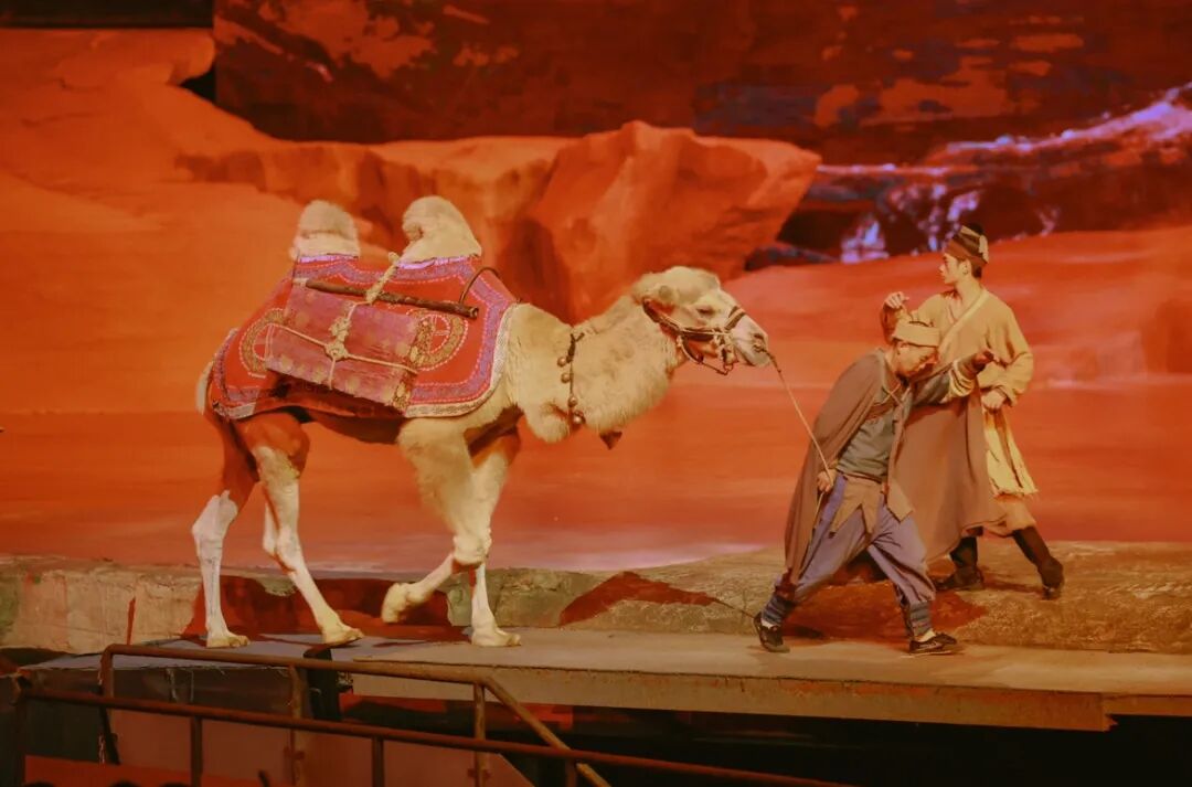 以盛唐丝路文明为魂,汇驼队、狼群、瀑布、佛光等西北元素,突破时空维度,再现千年商队穿越秦岭、横跨大漠的壮阔征程。让观众在苍狼长啸与驼铃声中,重走丝路万里征程。驼铃声响彻耳畔,丝绸之路的千年故事在360度旋转舞台上鲜活重生,东西文明在此完成一场跨越时空的对话