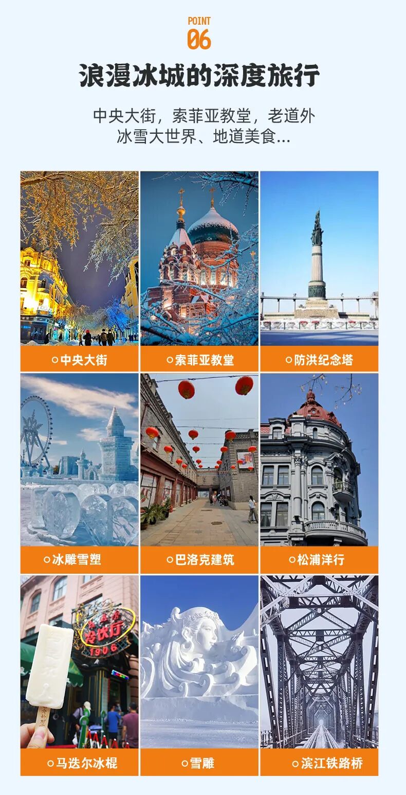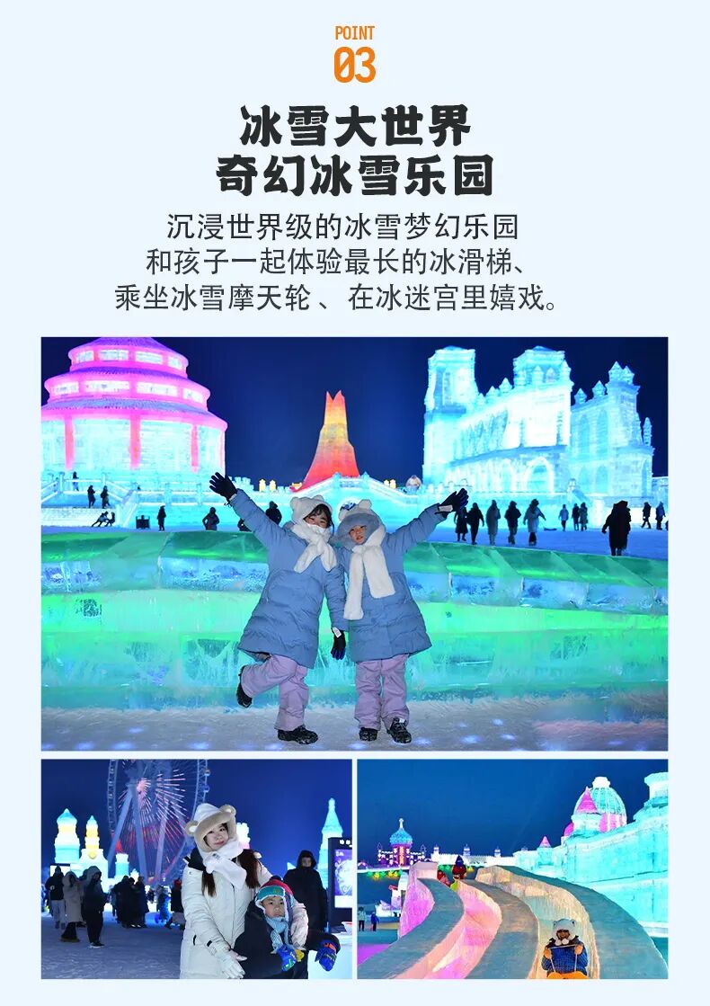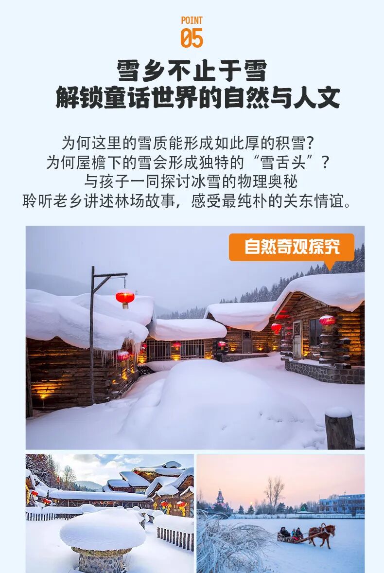 ④亚布力滑雪场滑雪3H(含雪鞋、雪板、雪仗)、马拉爬犁、雪地摩托、东北虎林园+观光车、雪乡门票+环保车、哈工大参观讲解、冰雪大世界门票、微冰雕制作体验;