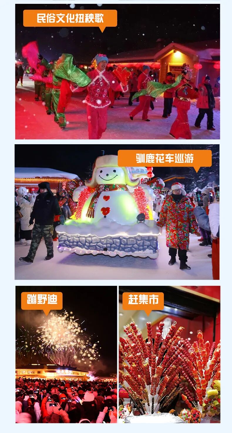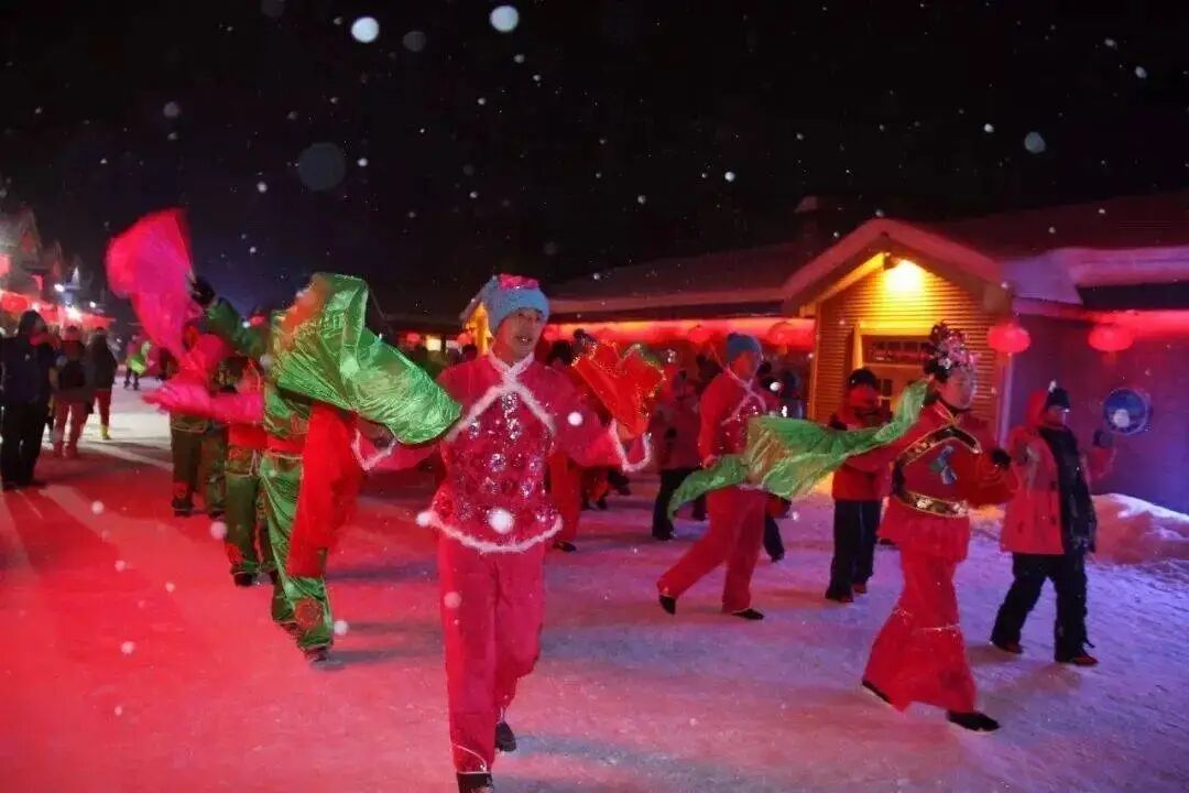 晚饭后,雪乡的夜生活才刚刚开始。扭秧歌的队伍敲锣打鼓地走来,您可以加入其中,跟着节奏尽情舞动;或是观看【驯鹿巡游】,与这些雪地精灵亲密接触。最后,在【万人蹦雪迪】的狂欢中,释放所有的热情,让欢声笑语响彻雪乡的夜空。