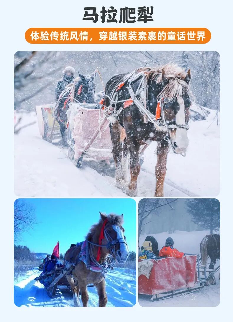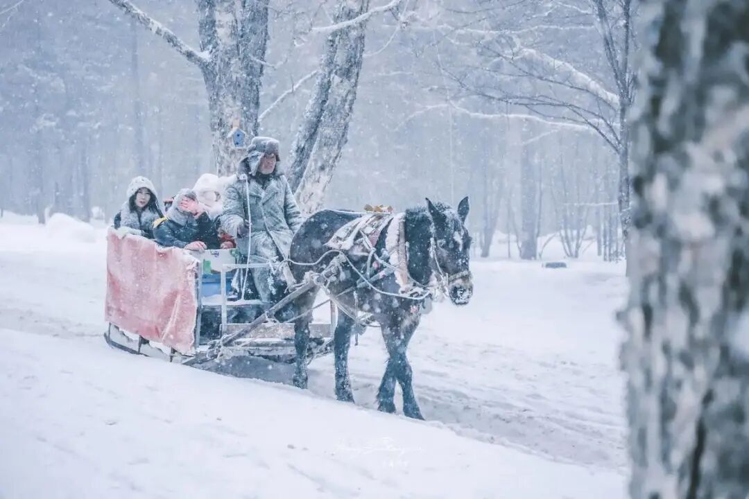 首先,我们将体验最原始的雪地交通工具——【马拉爬犁】。坐在铺着厚厚棉被的爬犁上,听着马儿的铃铛声,在雪原中穿行,感受一番东北“慢生活”的趣味。