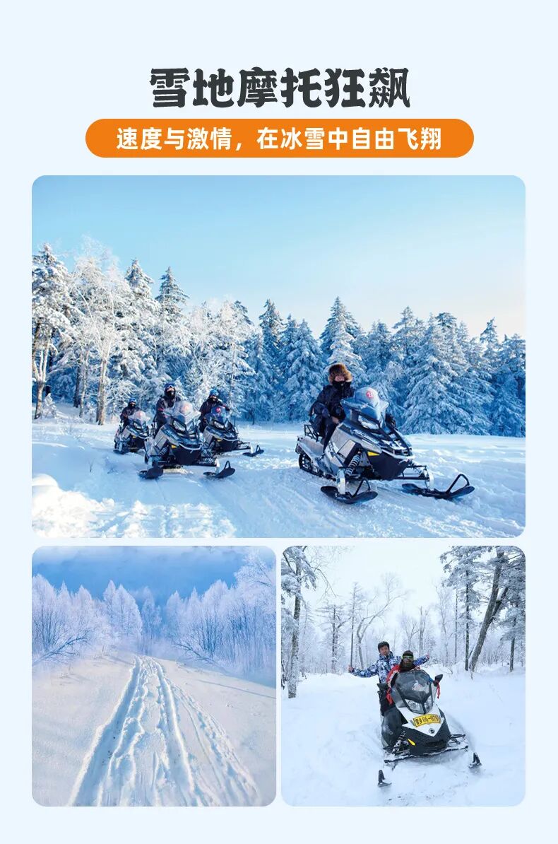 紧接着,让我们跨上【雪地摩托】,在无垠的雪原上尽情驰骋。风从耳畔呼啸而过,溅起的雪花在阳光下闪闪发亮,这一刻,我们都是自由的追风少年。