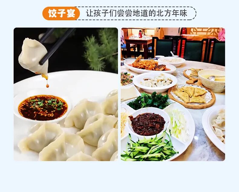 品尝东北最具代表性的美食——饺子和杀猪菜。各种馅料的饺子热气腾腾,酸菜血肠白肉锅驱散所有寒意,让孩子们尝尝地道的北方年味。