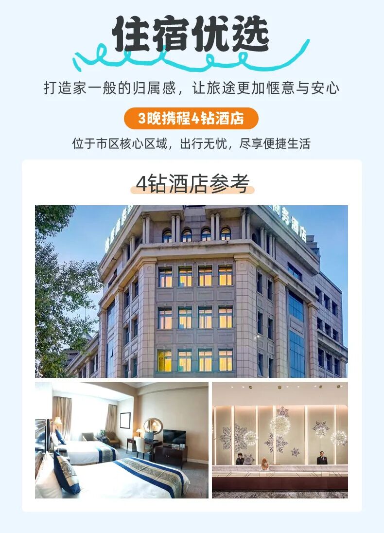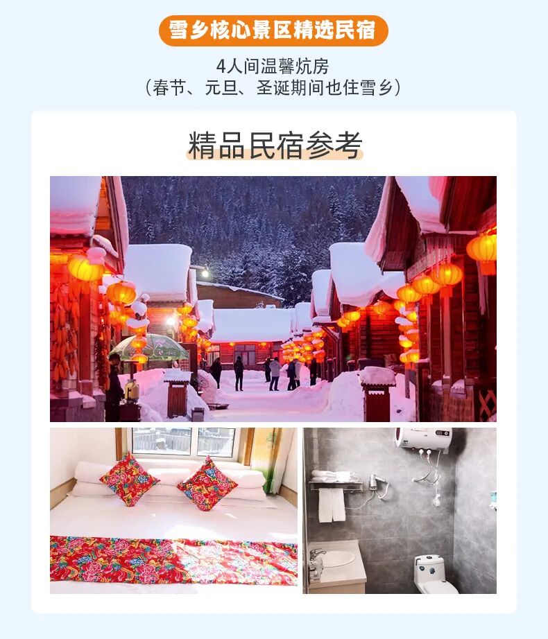 ⑤3晚哈尔滨四星级酒店住宿+1晚亚布力商务宾馆+1晚东北特色民宿农家炕;备注:雪乡农家炕为4人间同性拼住,如家庭包炕需补齐炕位。