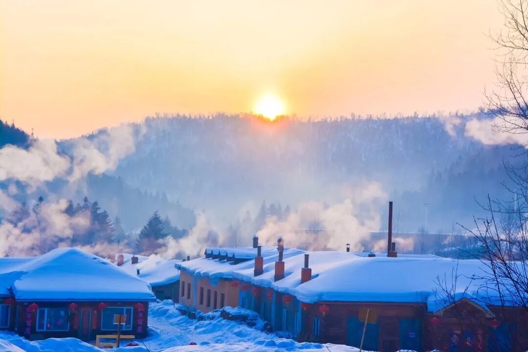 当第一缕晨光轻抚雪乡的屋檐,推开房门,清新的空气裹着凉意扑面而来,远处炊烟袅袅,整个雪乡仿佛一幅刚刚苏醒的水墨画。
