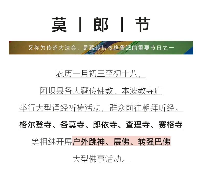 行程概览:早餐后前往【格尔登寺】,位于四川省阿坝藏族羌族自治州阿坝县城西北角,具有120多年的历史,是阿坝县规模最大的藏传佛教格鲁派寺院。结束继续前往【各莫寺】,又称慧园寺,位于四川省阿坝州藏传佛教三大格鲁派寺院之一,是黄教六大寺之拉卜楞寺的分寺之一,各莫寺以其宏大的寺庙建筑、大佛塔和神秘的藏秘修炼而著称。拍摄一年一度的阿坝莫郎节法舞藏戏。这是莫郎节热闹的一天,参观结束返回阿坝酒店。
