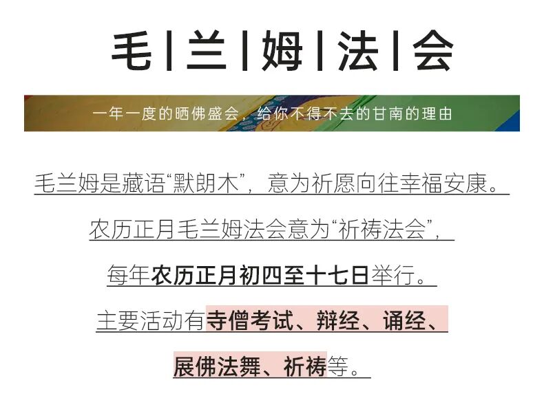 “毛兰姆”一词为藏语“默朗钦摩”的变音,意为“传召大法会”,为了纪念宗喀巴大师在拉萨大昭寺举行传昭法会,标志着格鲁派正式成立这一事件而创立,延续至今以近600年历史。展佛仪式上,有寺庙僧人将保存在寺庙中的举行唐卡抬至展佛台,随后所有僧人诵经,然后由正式拥有“比丘”资格的年轻僧人徐徐展开唐卡,再有当期群众前往膜拜,并抛撒哈达。展佛结束,僧人们卷起唐卡,送回寺庙精心保存,等到第二年再度展现在人们面前。