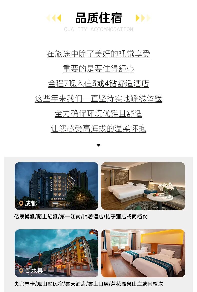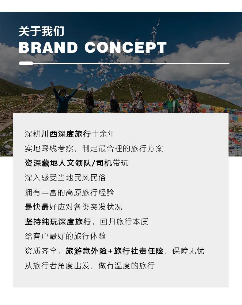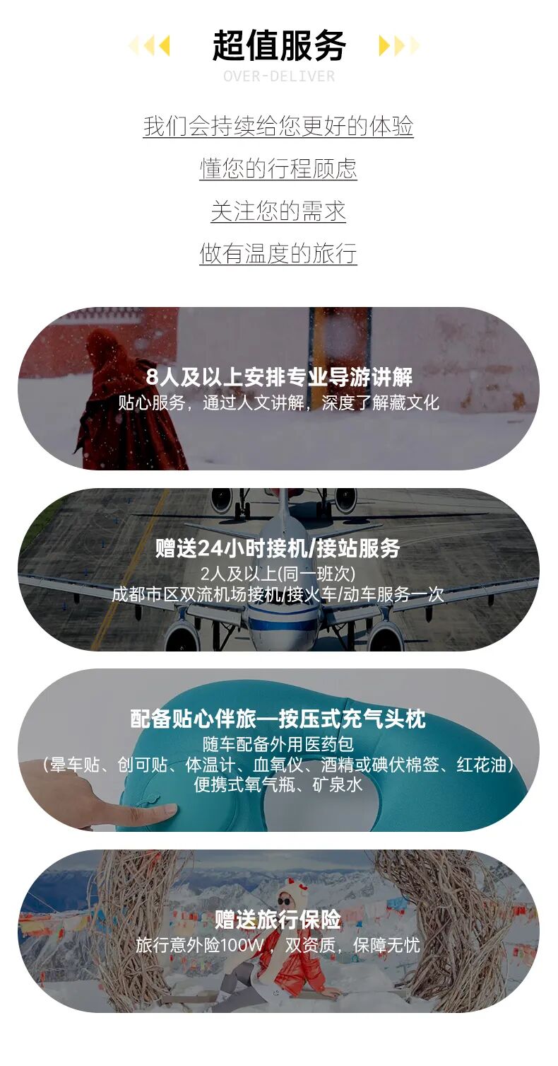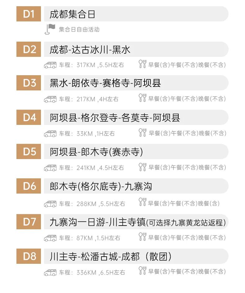 (3)正常情况最后一天抵达成都时间约为20:00左右。如果第8天选择离开成都,双流机场和高铁站建议订晚上22:30以后的航班或班次,天府机场建议订23:30之后航班。由于川西北地区路况较差,山道狭窄,有可能因为堵车、交通管制等情况而发生延误。请大家尽量预订次日返程的航班或车次。