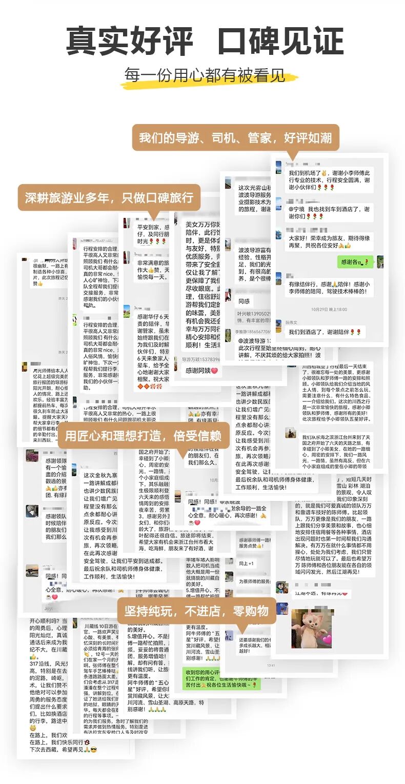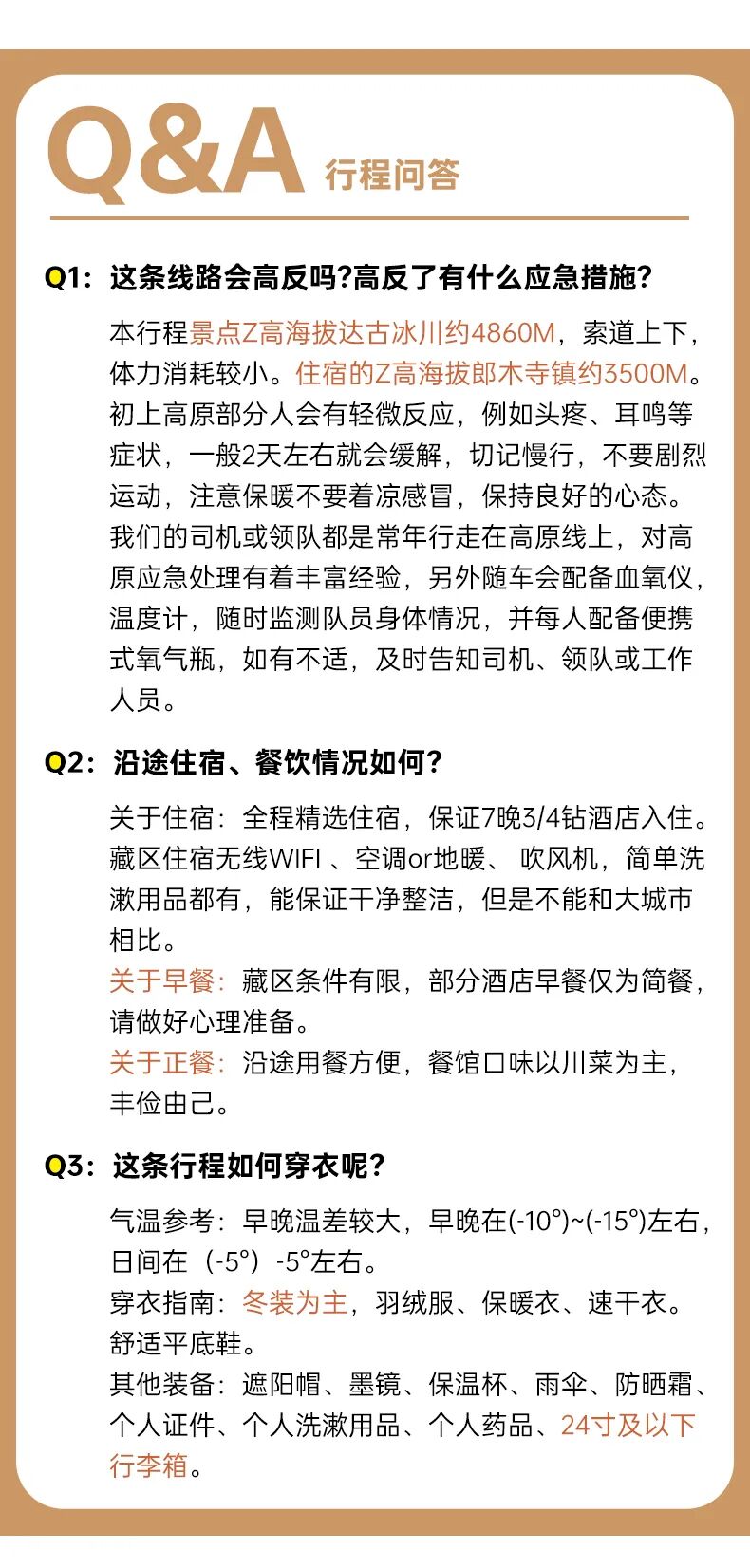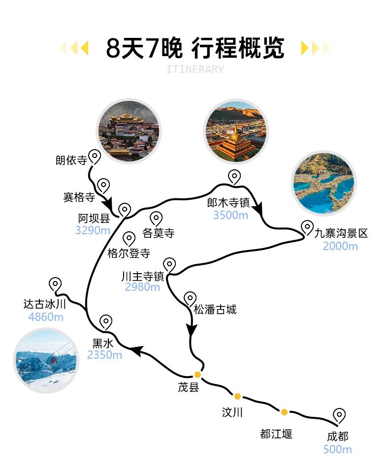 (3)正常情况最后一天抵达成都时间约为20:00左右。如果第8天选择离开成都,双流机场和高铁站建议订晚上22:30以后的航班或班次,天府机场建议订23:30之后航班。由于川西北地区路况较差,山道狭窄,有可能因为堵车、交通管制等情况而发生延误。请大家尽量预订次日返程的航班或车次。