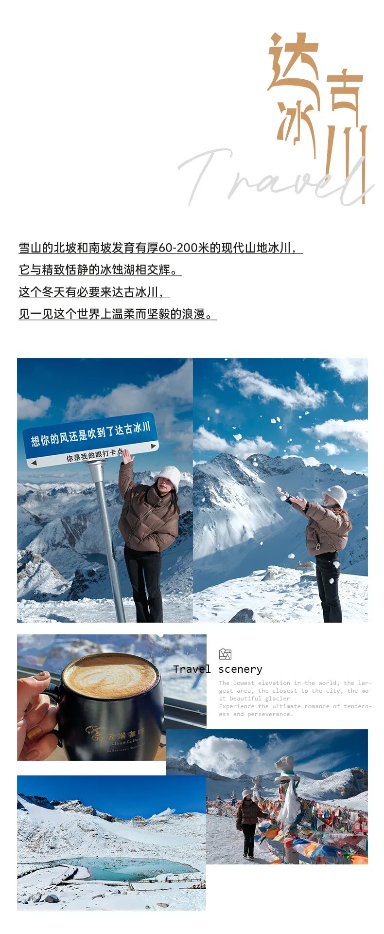 行程概览:早餐后出发,路径映秀,汶川,茂县可观沿途川西风景,后到达【达古冰川】,从景区门口坐观光车(费用自理)沿着黑水河逆流而上,一路可以游玩金猴湖、红军湖和则娜措等几个高山海子。可乘坐索道上到山顶的冰川腹地,观赏【一号冰川】,感受一览众山小,俯视一切的雄壮气概,自费点一杯【世界上最孤独的咖啡馆】饱览美景。