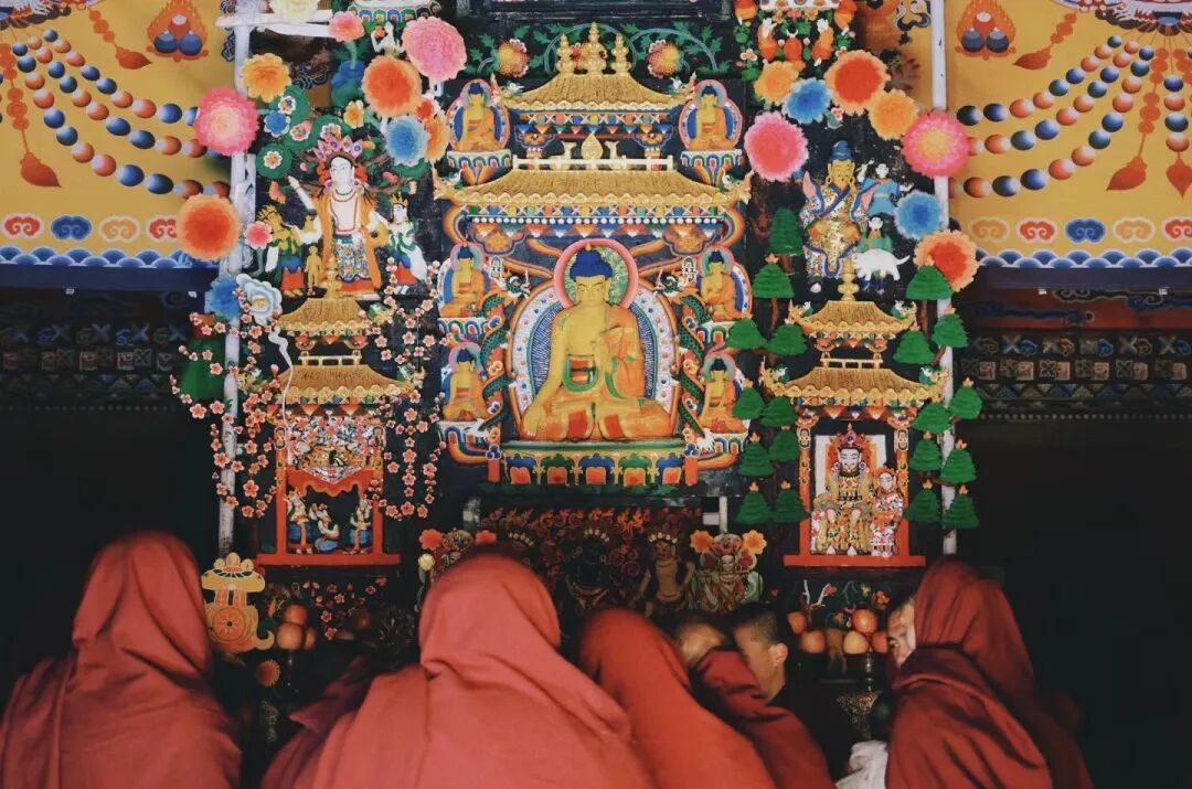 2.僧人从寺庙中鱼贯而出,在指定的位置坐定。