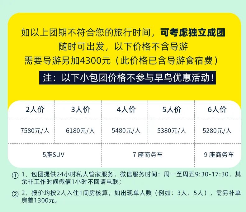 注:8人精品小团:司机兼向导,8人封团。20人散拼大团:9人即配专业导游,20人封团。